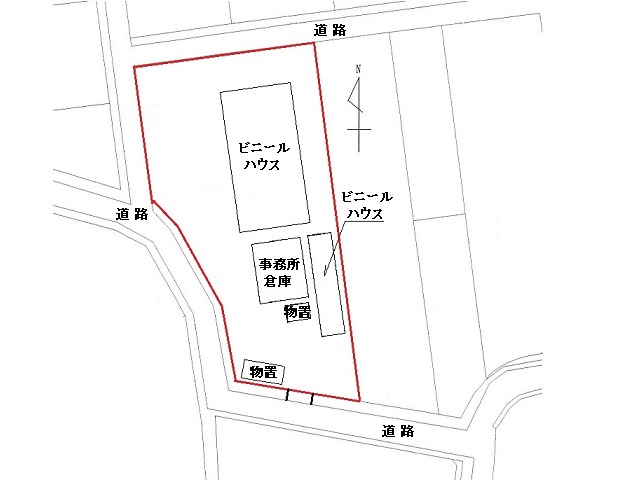 敷地面積:1,685㎡(509.71坪) 動産類多数有り(処分相談)、賃料等応談 R4. 1 ビニールハウス一部修繕